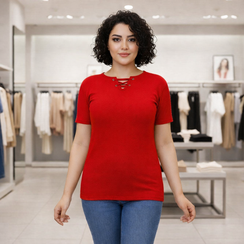 تیشرت یقه پرچ وبندی زنانه